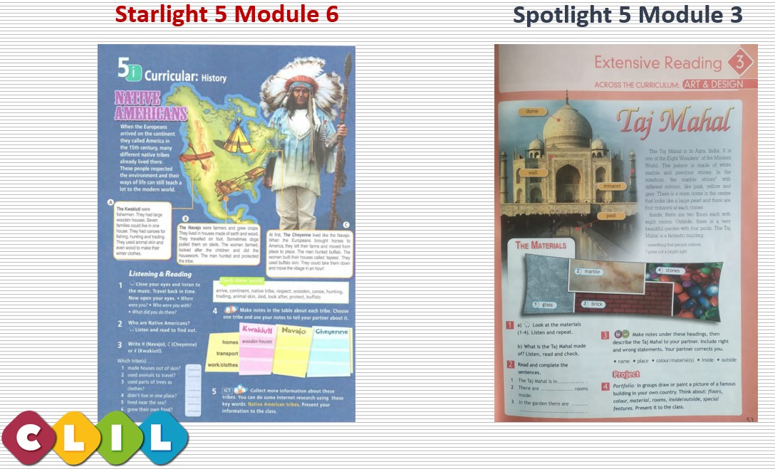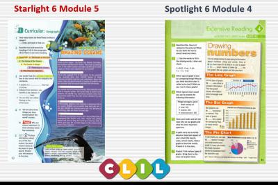 Таким образом, этот метод успешно используется на уроках и постепенно осваивается учителями нашей гимназии. В нашей школе используется УМК издательства «Просвещение» «Starlight» в классах с углубленным изучением английского языка и УМК “Spotlight” в остальных классах. Данные УМК – это наглядный пример межпредметного языкового интегрирования. В каждом модуле мы можем найти разнообразную тематику: перед вами сейчас лишь по одному примеру из учебников разных классов.