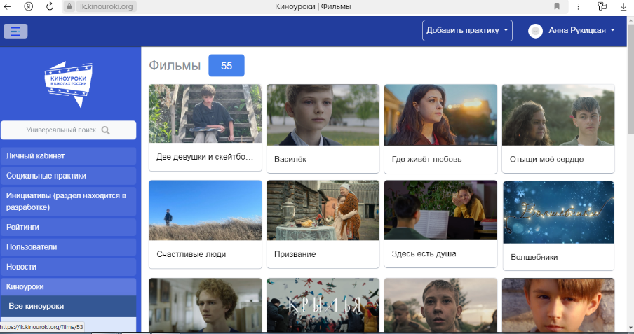 Киноуроки в школах России: https://lk.kinouroki.org/films/35. Предлагаемая система ориентирована на воспитание у школьников внутренних нравственных качеств личности, которые напрямую влияют на образ мышления, формирование объективной оценки собственных и чужих поступков, а также их последствий для человека, окружающей среды, государства.