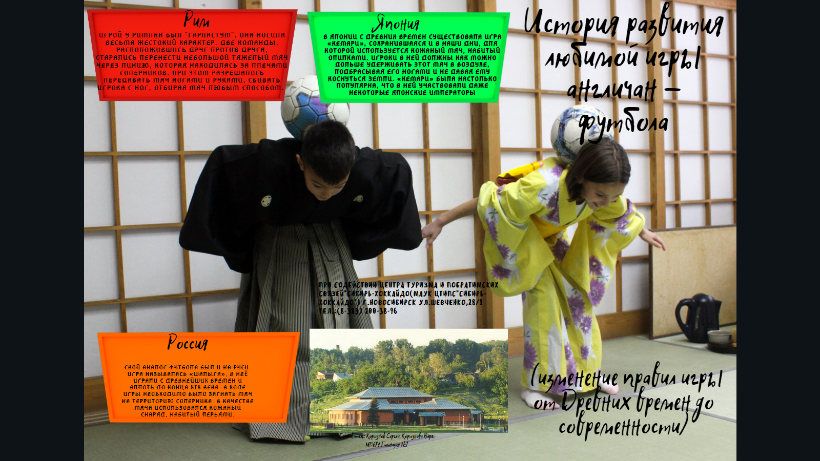 Также ребята раздали каждому буклет по истории развития любимого футбола. Для создания этого буклета они специально ездили в Центр туризма и побратимских связей «Сибирь-Хоккайдо», где им разрешили провести фотосессию для буклета и предоставили наряды.