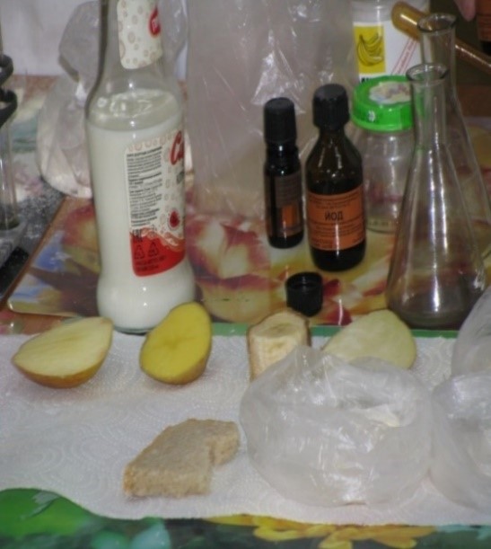 В работе нам понадобились стакан, стеклянные палочки, пипетка, пробирки, колбы, фильтровальная бумага, йодная настойка, вода. Растворители: вода, спирт, бензин; пищевые продукты: свежий картофель, кусочки банана, яблока, груши, хлеба, манная крупа, рис, мука, молоко, сахар. Рисовый отвар, приготовленный заранее, белая бумага, пластинки металла.