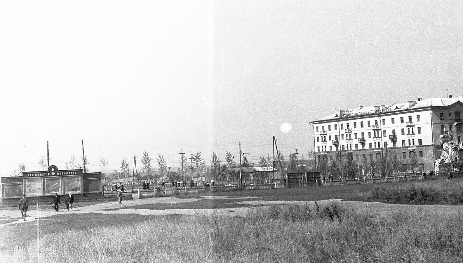 На фотографиях видно угол дома, который сейчас имеет адрес Станиславского,6/Пархоменко,12. Он был сдан в 1954 году. А на огромном пустыре, запечатленном на фотографии, в 1958 году будет воздвигнут Дом Советов – здание администрации района.