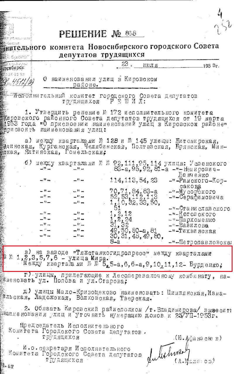 23 июля 1953 года принимается решение Исполнительного комитета Новосибирского городского Совета депутатов трудящихся о наименовании улиц в Кировском районе.