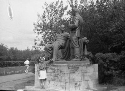 Первоначально предполагалось, что напротив нашей школы будет построен еще один квартал (приложение 1). Однако это не было реализовано. И в 1967 году напротив 33 квартала будет возведен Монумент Славы, но еще в 1950 годы там был небольшой сквер, где отдыхали жители. Об этом говорят и воспоминания очевидцев, и фотографии из архива школы. Именно в этом небольшом скверике стояли два памятника Сталину, которые не сохранились до наших дней.