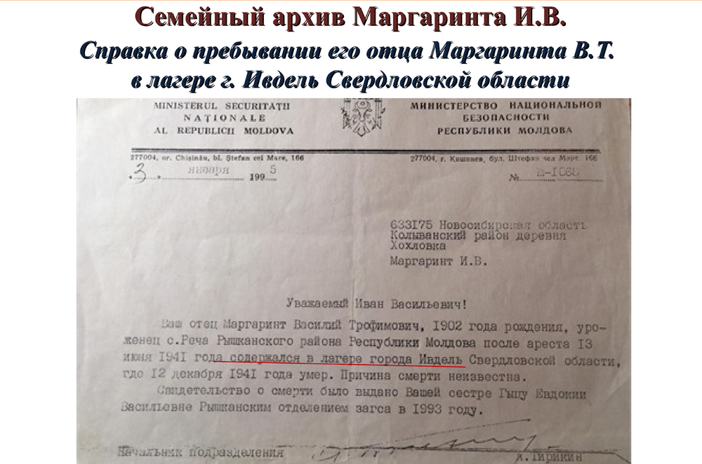 Эшелон с Анной Михайловной и её тремя детьми шел за Урал, в Сибирь. Куда отправился поезд с мужчинами, члены семьи тогда не знали. Позже стало известно, что главу их семьи Василия Маргаринта привезли в Свердловскую область, в Ивдельский лагерь. Василий Трофимович был членом Либеральной партии Румынии, и его осудили как «социально опасного элемента». Из лагеря он так и не вернулся. 12 декабря 1941 года погиб при неизвестных обстоятельствах. Скорее всего, он был расстрелян как «враг народа».