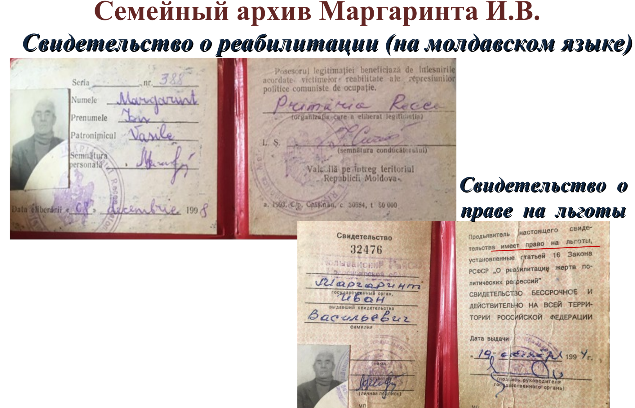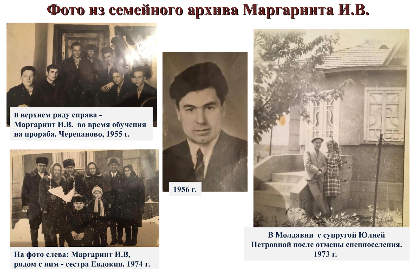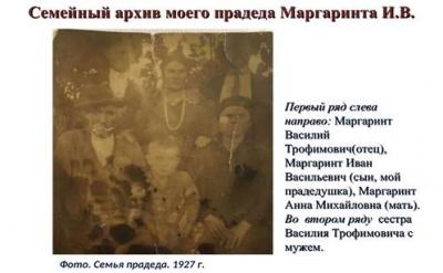 Изучая историю своей семьи, я заинтересовалась судьбой своего прадедушки Ивана Васильевича Маргаринта, который стал для меня особым примером сильной личности, способной пройти через многие жизненные испытания и при этом сохранить лучшие человеческие качества. Хочу поделиться рассказом о его жизненном пути. Рассказом, составленным из личных воспоминаний, фотографий из семейного архива и документов, подтверждающих те или иные сведения.