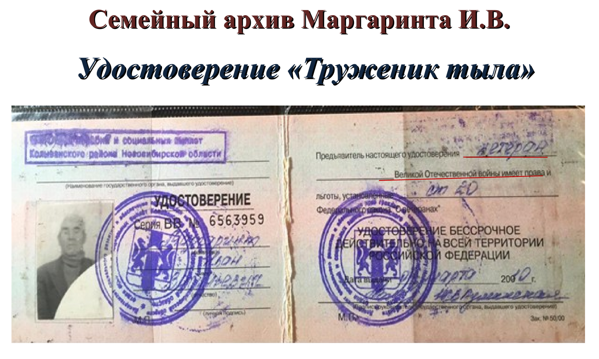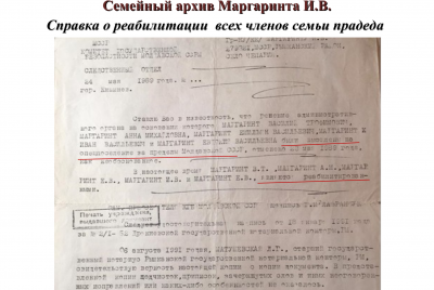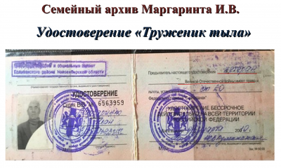 Мой прадедушка Иван Васильевич Маргаринт был не только реабилитирован, но и признан тружеником тыла. Был награжден юбилейными медалями ко Дню Победы. В 2020 году получил нагрудный знак «Новосибирск – город трудовой доблести и славы».