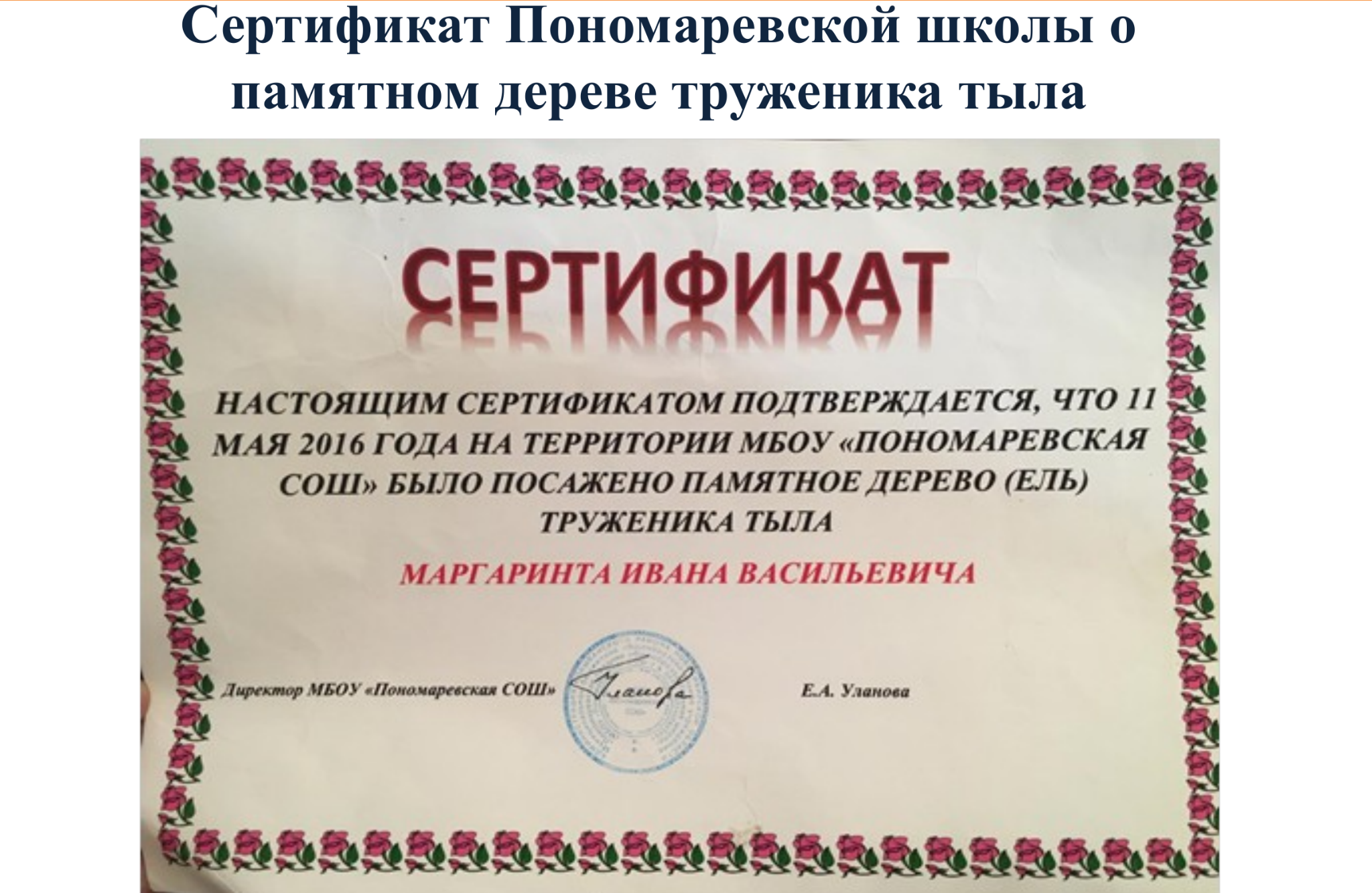 В 2016 году на территории Пономаревской средней общеобразовательной школы Колыванского района посажено памятное дерево в честь труженика тыла Маргаринта Ивана Васильевича.