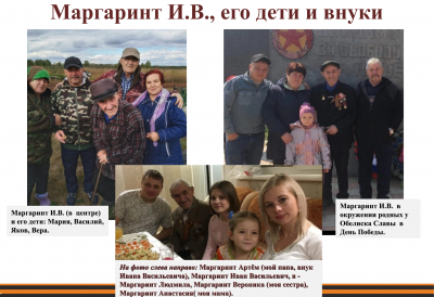 В настоящее время прадедушка живет в нашем селе Чистополье Коченёвского района Новосибирской области. Кроме него, здесь проживает пять семей с фамилией Маргаринт. Это дети, внуки и правнуки Ивана Васильевича. В их числе и семья моих родителей – моя семья.