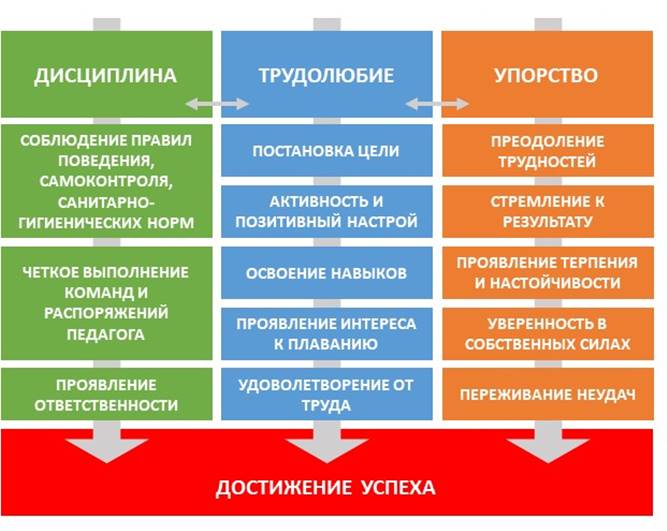 Понятие «успех» сформулировано и определено в комплексе упражнений. Для определения уровня «успеха» разработан «Протокол успехов», в котором отмечается как уровень освоения плавательных навыков, так и уровень проявления личностных качеств: дисциплинированности, трудолюбия, упорства.