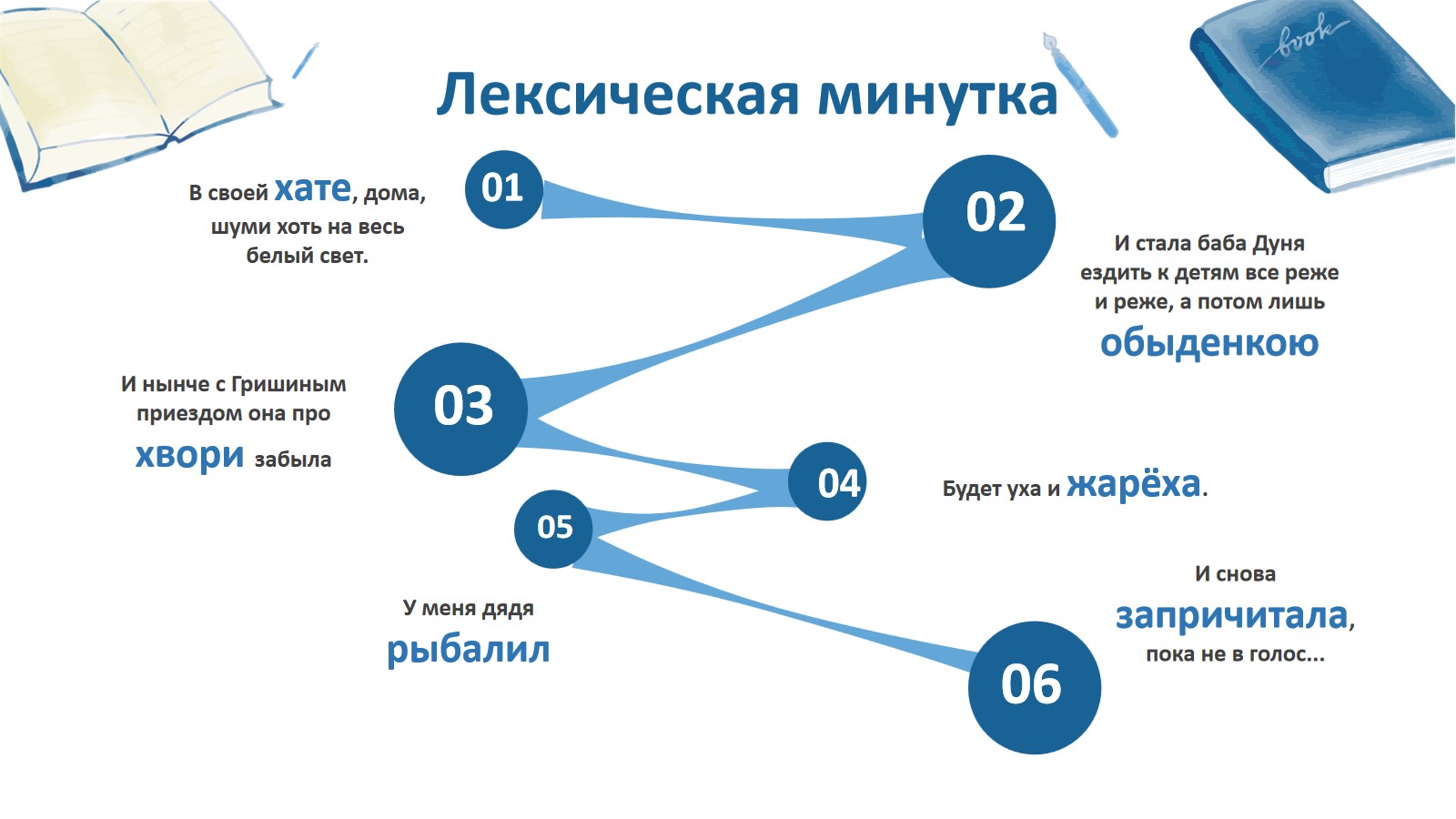 Слово «хвори» позволяет провести лексическую минутку. Для этого вспоминаем разговорные слова из текста рассказа, объясняем их значение. (Делаем раздаточный материал. Отдельные словосочетания записываем в тетрадь и поясняем.) Приходим к выводу, что разговорные, просторечные слова характерны для речи бабы Дуни, потому что эта женщина из простого народа, живёт в деревне, привыкла так говорить. Но это не мешает внуку понимать бабушку.