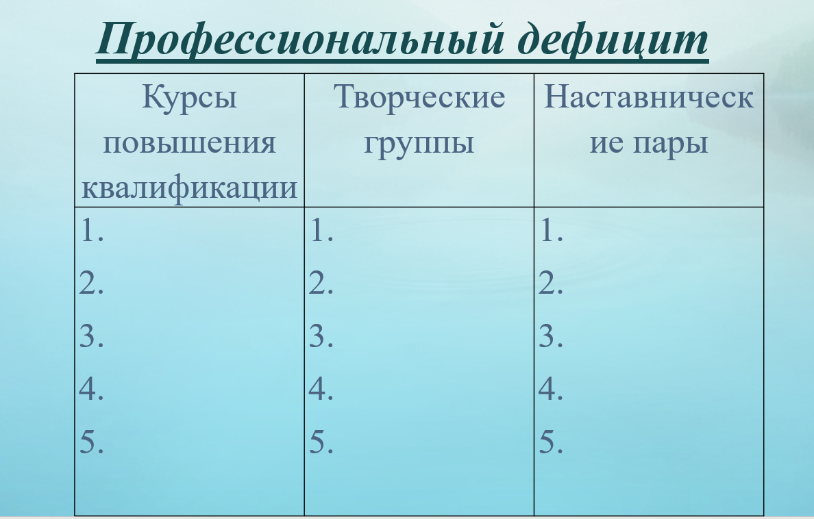 Руководитель МПК или ШМО должен определиться, какой из предложенных вариантов, на его взгляд, будет самым эффективным при работе с указанным профессиональным дефицитом: работа в творческих группах, создание наставнических пар повышение квалификации