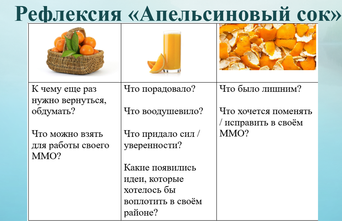 И в заключение проводим рефлексию (например, «Апельсиновый сок»).