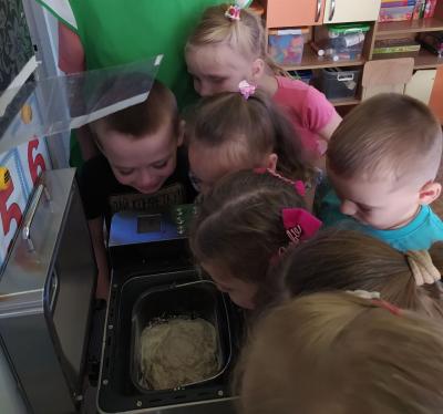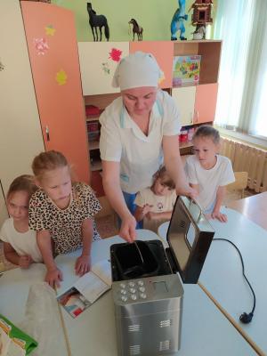 А теперь я предлагаю вам испечь с моей помощью самый простой пшеничный хлеб при помощи хлебопечки. Хлеб будет готов через несколько часов, его нужно вымесить, ему нужно подняться при помощи волшебных дрожжей и испечься. Пробовать хлеб мы будем после сна во время полдника. Вместе с детьми закладываем в форму ингредиенты и ставим на выпекание. И сразу после этого я предлагаю замесить опару, чтобы понаблюдать, как начинают действовать дрожжи, как появляются пузырьки, понюхать и предположить, чем пахнет тесто. Объяснить, что то же самое происходит в хлебопечке, но медленнее. В конце вместе с детьми делаем вывод, что хлеб, прежде чем попасть к нам на стол, проходит очень длинный и трудный путь.