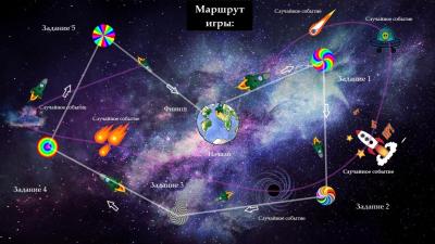 Суть игры. В соответствии с сюжетом, команда «Защитники космоса» выходит на околоземную орбиту и приступает к поиску скоплений космического мусора (загрязнений). После нахождения необходимой цели необходимо приблизиться к ней (данные события показываются на электронной доске). По пути участникам группы могу выпасть до 3-х случайных событий, которые содержат в себе специальные задания для отдельных групп. После того как участники справятся с испытаниями и доберутся до основного скопления (основное задание), им будет необходимо нейтрализовать его (решить задачу). Уничтожение цели происходит посредством выстрела из специально разработанной «пушки-нейтрализатора», управляемой компьютером. Перед «выстрелом» компьютер проводит проверку всего экипажа на «человечность» («докажите, что вы не робот»). Для этого игрокам необходимо решить соответствующие задания (пазл, анаграмма, лабиринт и т.д.), которые появятся на доске. Время на решение ограничено – 2 минуты. Если задание по какой-то причине не было выполнено, компьютер сочтет, что людей на корабле нет и им управляет «системный вирус», после чего запустит протокол на ликвидацию корабля. Команде предоставляется 3 попытки на повторное решение. После того как все задания будут выполнены, учащиеся прослушивают информационную/историческую справку о соответствующем скоплении космического мусора и решают специальный «кейс». Далее по результатам решения высчитывается, насколько команде удалось уничтожить загрязнение (в процентах, от 10 до 100). Затем участники переходят к следующему загрязнению (заданию) до тех пор, пока не очистят околоземную орбиту от всех загрязнений (всего таких 5).