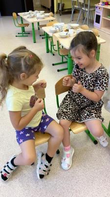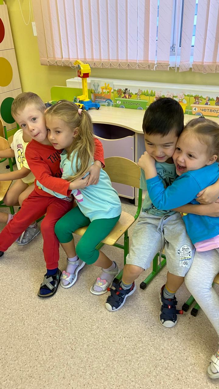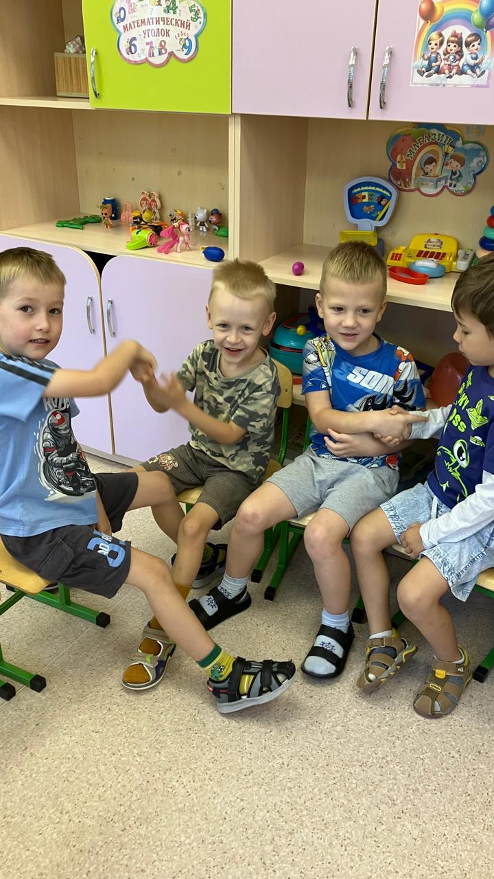 Вот таким необычным способом мы приветствуем друг друга. Этим способом невербального приветствия мы помогаем детям побороть страхи, стеснения во взаимодействии со сверстниками.