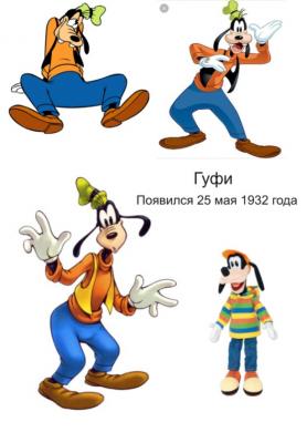 Гуфи – настоящий джентльмен, спортсмен и просто обожает своих друзей. Гуфи вдохновляет всех своим юмором и весельем, и чем бы он ни занимался, это всегда вызывает улыбку. Впервые Гуфи появился 25 мая 1932 года