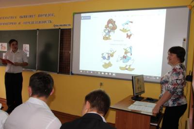 Учитель рассказывает о персонажах, демонстрируя картинки на экране