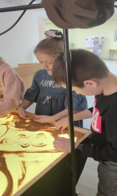 В рамках дополнительного образования мы посещаем Областную детскую библиотеку им. А.М. Горького. Там рисовали в группе песком фантазийное животное.