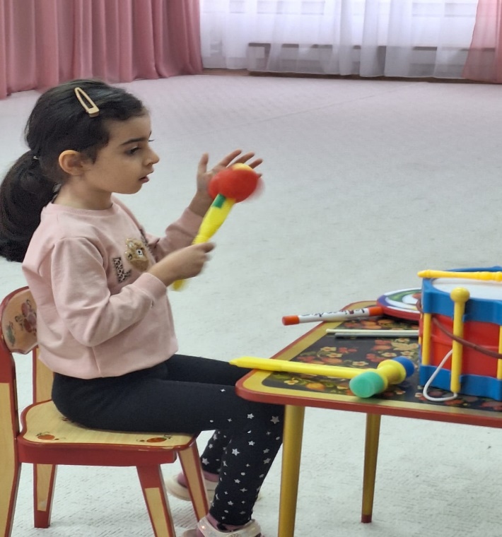 «Живая» игра на фортепиано вкупе с неспешным, спокойным пением и тоном педагога, как правило, побуждает детей ритмически играть на музыкальных инструментах, вызывает положительный отклик, удовлетворение эмоциональных потребностей, желание выразить себя в движении, танцуя со взрослым (раскачиваясь, кружась, приседая, хлопая), выстраивая процесс коммуникации, взаимоотношений между звуками музыкальных инструментов и его собственным голосом, возможность выразить свое отношение к окружающему миру средствами звуковой палитры. Вполне возможно, что тяга к музыке, особенно у детей, посещающих 2-3 года группы ДОУ с педагогами-дефектологами, воспитателями-профессионалами, психологами, рождается из ощущения полной погруженности в музыкальное пространство, создаваемое кем-то или им самим. Для ребенка важно иметь или обрести что-либо, что вызвало бы у него сильное впечатление (музыкальный инструмент, предмет атрибутики – платочек, ленточка) и усилило желание взаимодействовать с музыкальным руководителем в большом музыкальном зале недолго, но заинтересованно. Непредсказуемые реакции на звучание музыкальных инструментов, голос могут быть или нет, но увидеть признаки удовольствия или недовольства, желания запоминать, повторить или избежать и закрыться, возможно всегда.