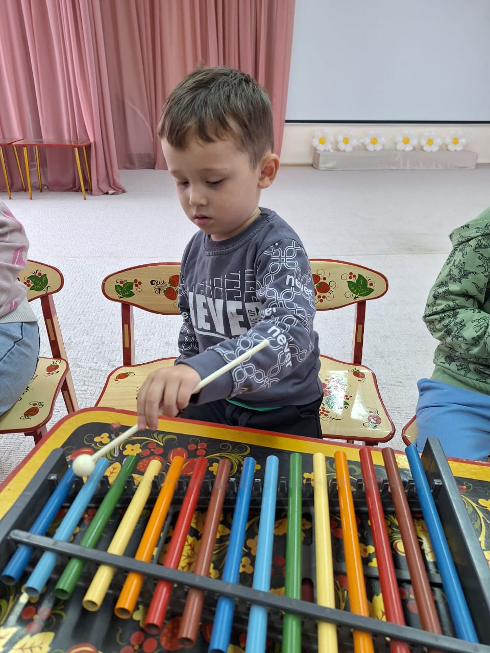 Одним детям нравится электронная, обработанная музыка, льющаяся из колонок, магнитофонов, гаджетов, другие предпочитают «живое» исполнение на рояле, участвуя в музицировании, параллельно играя или отстукивая ритм на музыкальном инструменте палочками (металлофоне, барабане, бубне, ксилофоне), бережно и аккуратно, не ломая инструмент, с воодушевлением прислушиваясь к каждому звуку, дети воспринимают музыку по-разному. Музыкальный руководитель предлагает инструменты не в пустом помещении, а в музыкальном зале, где много отвлекающих и ярких предметов, которые одних пугают, настораживают, других располагают взаимодействовать с уже знакомым, интересным местом – хранилищем музыкальных игрушек, инструментов, контактируя (физически, тактильно), выполняя простейшие танцевальные движения или вкладывая в руку музыкальные палочки, инструменты, держа за руку фактически пришельца-инопланетянина из другой Вселенной, который тебя воспринимает иначе, через призму собственного видения, слышания и понимания и несказанно радует и вдохновляет, когда спокоен и улыбчив.