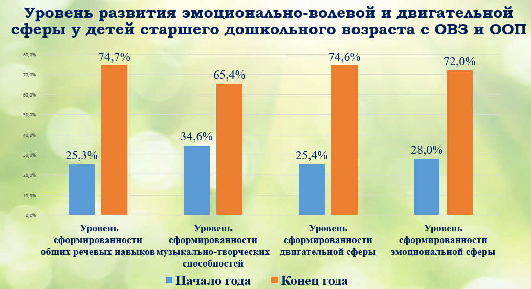 Анализируя результаты, мы сделали вывод, что уровень развития эмоционально-волевой и двигательной сферы у детей старшего дошкольного возраста значительно повысился. Особенно показатели уровня сформированности общих речевых навыков и двигательной сферы, которые увеличились почти в 3 раза по сравнению с началом учебного года.