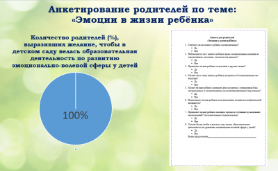 Изучая данный вопрос, нами было проведено анкетирование родителей по теме «Эмоции в жизни ребёнка», которое помогло выявить представление родителей об особенностях эмоционального развития ребенка. Часть родителей считали, что их дети не всегда проявляют эмпатию по отношению к своему ближнему окружению и иногда могут не контролировать свои эмоции. Поэтому все родители выразили желание и согласие, чтобы в детском саду велась образовательная деятельность по развитию эмоционально-волевой сферы у детей.