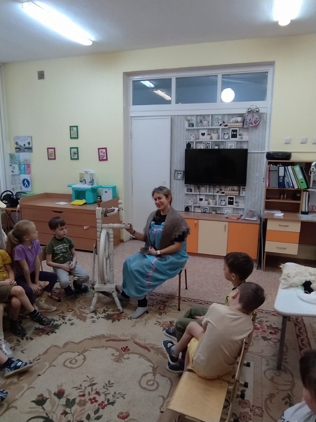Родители воспитанников нашей группы принесли из дома различные предметы старины, среди которых была прялка и старинное веретено.
