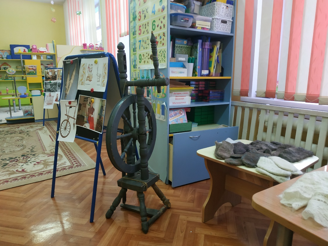 1. Стоит прялка, рядом лежит одежда из шерсти.