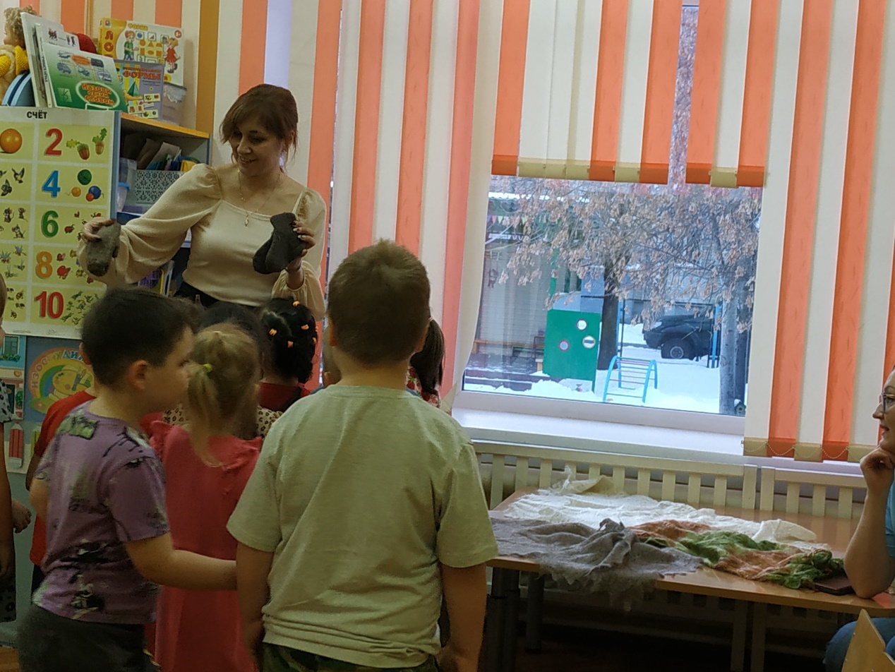 В: Ребята, для холодного времени года раньше пряли одежду из шерсти. Но летом в ней было жарко ходить. Поэтому люди научились ткать более легкую ткань, научились изготавливать нити из крапивы, льна, хлопка, шерсти животных. Изготовление нити называется прядение.