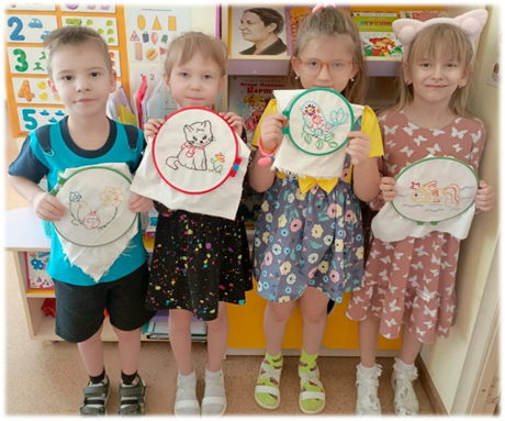 Ребята с удовольствием вышивали. Ведь такие работы привлекают своими результатами детей. Дошкольники испытывают гордость и радость за вышитый подарок для мамы, папы, бабушки, дедушки. Многие вышивки мы отправляли на различные конкурсы, получали призовые места.