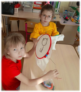 Большую помощь в организации обучения вышиванию детей оказали родители: приобретали материал (канву, пяльцы, мулине), помогали подбирать сюжеты для вышивки, оформляли выставки, проводили дома беседы с детьми по технике безопасности при работе с иголкой и ниткой, закрепляли навыки вдевания нитки в иголку.