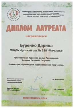 Диплом лауреата в открытом фестивале творчества детей с ограниченными возможностями здоровья «Поверь в мечту»