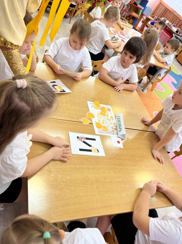 Осень: Спасибо, ежик. (Осень раскладывает картинки на столы). А теперь мы с вами разделимся на команды, чтобы играть дальше. Смотрите внимательно, каждый листок полетит к своему дереву. Например: если у Ромы лист с березы, он будет называться березовый листок и он полетит к картинке с березой и т.д. Первая команда – это первый месяц осени и у него дерево – береза. А вы знаете названия осенних месяцев. За каждый правильный ответ команда получает фишку. У какой команды больше фишек будет в конце развлечения, занимает 1 место и т.д. Сентябрь – ставлю название месяца. Второй стол – (дети называют 2 месяц осени, получают фишку) – Октябрь. На третий месяц (дети называют 3 месяц осени, получают фишку) – Ноябрь.