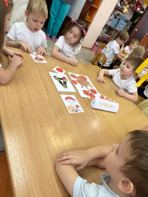 Еж: Получайте, грибы. А вы знаете, как они называются, а вы знаете, под какими деревьями они растут? Посмотрите, видите на полянке грибочки? Вы грибочки не топчите, они хрупкие. Сначала собирает грибы сентябрь. Несите грибочки к березе.