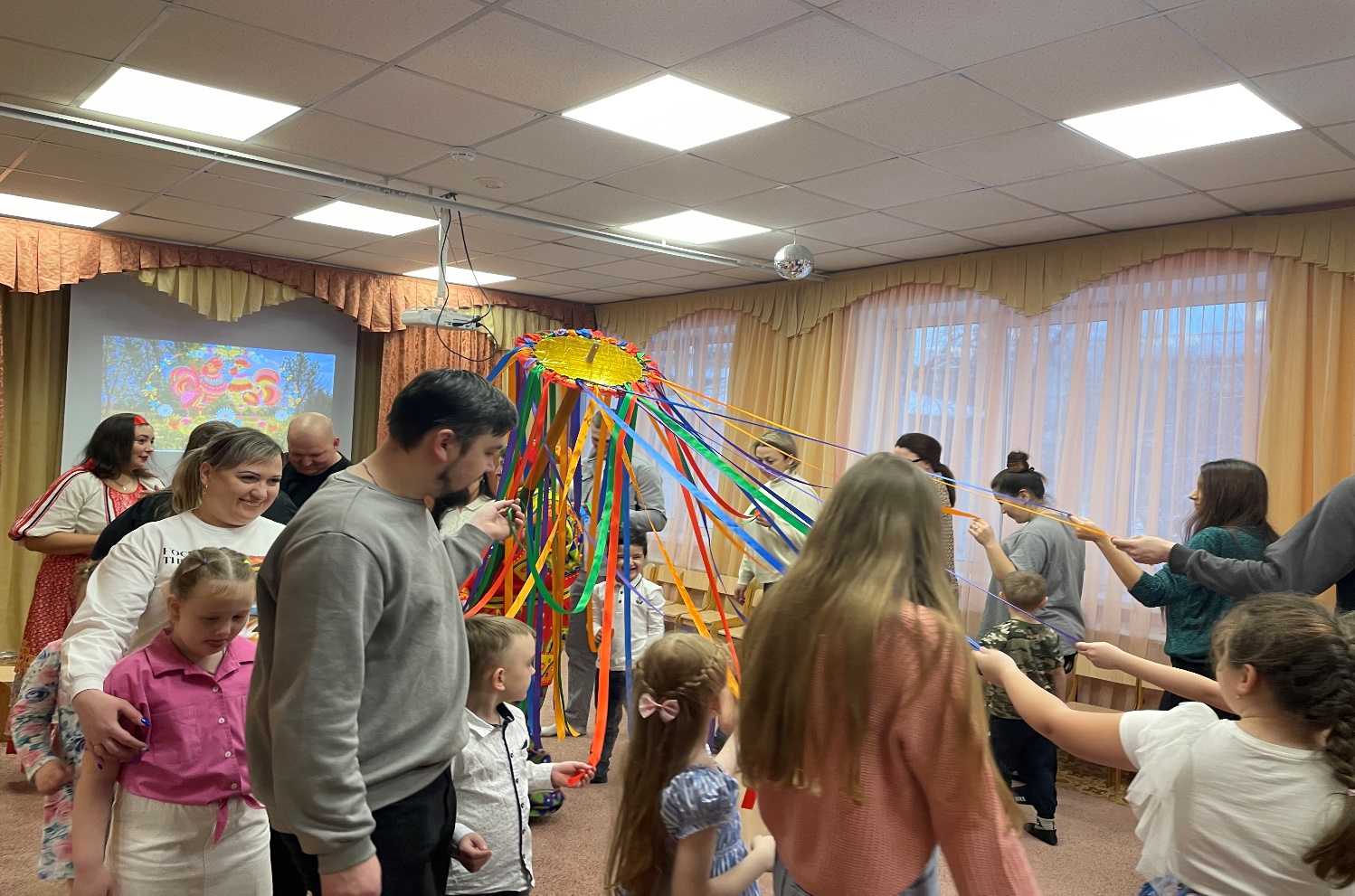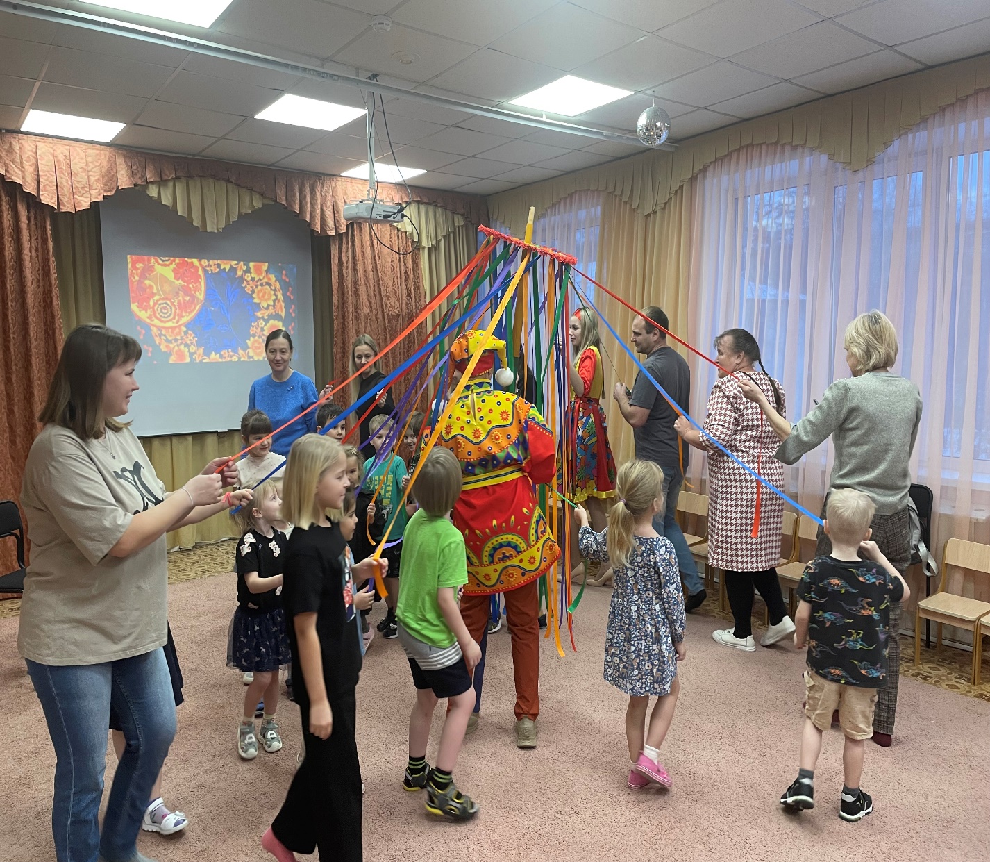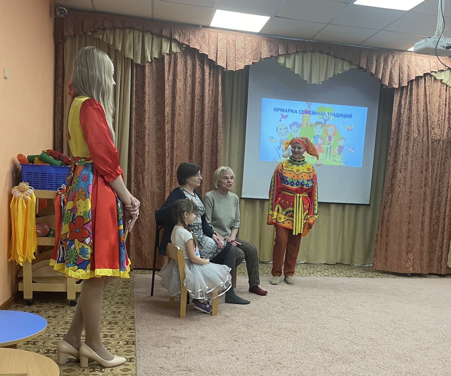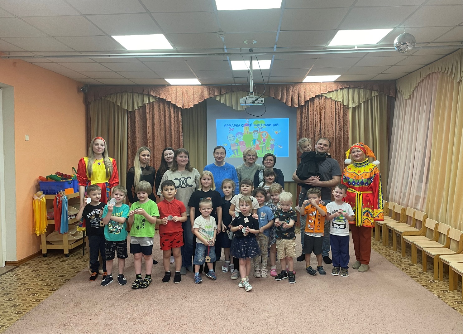 Веселые Скоморох и Девица встречают гостей в музыкальном зале, катая всех на семейной карусели. Мы напомнили всем как можно называть папу, маму и детей в семье, как выяснилось для этого есть много ласковых, добрых слов. Оценивать каждую традицию мы предложили купчихам, которые пополняли бюджет семей участников рублями.
