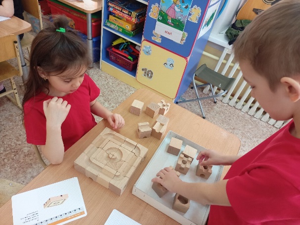 – Давайте построим костёр из «CUBORO» по схеме (детям предлагается схема).