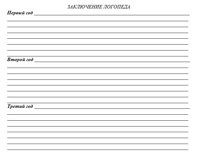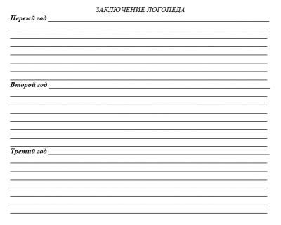 Первое тесное знакомство учителя-логопеда с воспитанником, имеющим тяжелые нарушения речи, происходит на углубленной диагностике после поступления в комбинированную (логопедическую) группу. Логопеду необходимо войти в контакт с ребенком, расположить к себе, чтобы получить наиболее точное понимание о состоянии речи ребенка. Уточняется состояние артикуляционной моторики и строения органов артикуляции, звукопроизношения, фонематического слуха, слоговой структуры слова, лексической и грамматической сторон речи, связной речи, понимания предложно-падежных конструкций. В конце обследования пишется логопедическое заключение на каждый год обучения. На каждого обследованного ребенка заполняется речевая карта, составленная на основе речевой карты Крупенчук О. И., являющаяся важным документом, так как позволяет отслеживать динамику работы с воспитанником. Ниже представлен титульный лист речевой карты, в который записываются данные о ребенке, также последняя страница с данными о речевом заключении.