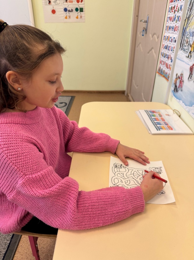 Для данного упражнения потребуются печатные пособия, которые легко можно изготовить самим, либо же воспользоваться интернет-ресурсами, а также цветные карандаши. Ребёнок должен пройти лабиринт, произнося при этом нужный звук, слог или слово. Целью данного упражнения является синхронизация работы полушарий, развитие восприятия информации, улучшение запоминания информации, развитие мелкой моторики, автоматизация звуков при изолированном произношении, а также в слогах, словах.