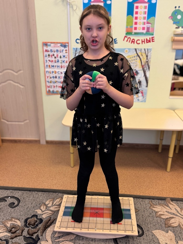 Упражнение проводится с использованием доски-балансира (доска Бильгоу) и кинезиологического мяча или мешочка. Ребёнок, удерживая равновесие на специальной доске, ловит брошенный педагогом кинезиологический мячик и одновременно выполняет речевые задания. Упражнение идеально подходит при автоматизации звуков, развития диалогической речи, фонематического восприятия, зрительно-моторной координации, моторной ловкости.