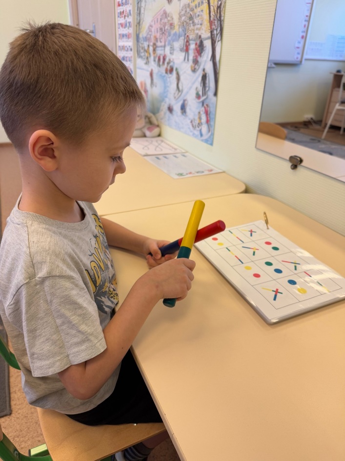Цветные клавесы – это две палочки округлой вытянутой формы, изготовленные из дерева и покрашенные с разных сторон разными цветами красок. Для данного упражнения также потребуется заранее изготовленное поле с изображением клавесов в разных положениях. Ребёнок, опираясь на наглядность, оперирует палочками, при этом произнося заданный речевой материал.