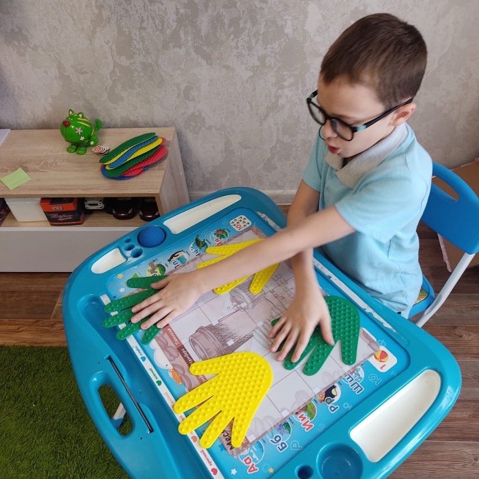 Упражнение направлено на активизацию межполушарного взаимодействия и моторного планирования. Используется для автоматизации звуков в слогах и словах. Также с помощью таких упражнений удобно работать с дифференцируемыми звуками. Например, желтая ладошка – произносит СА, зелёная – ША и т. п.