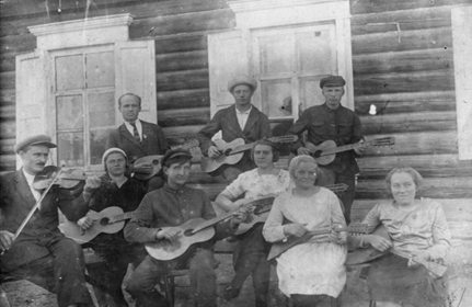 Струнный оркестр колхоза им. Э. Тельмана на фоне школы. Начало 1930-х гг.