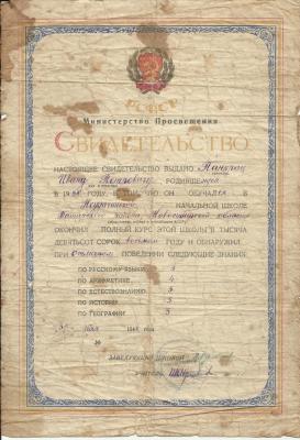 Свидетельство Ивана Панкраца об окончании начальной школы, 1948 г.