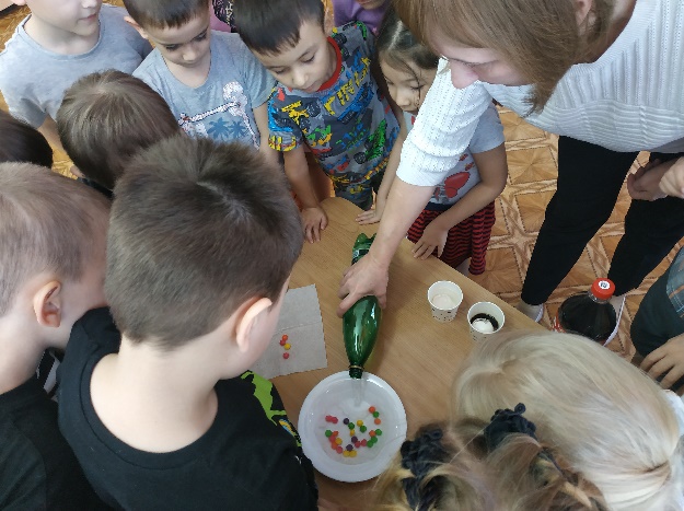 Воспитатель: Почему это произошло? (Дети: в них добавлены краски, они растворились) Да, в конфеты добавлены красители. Это вредные вещества. Они вызывают аллергию, портят наши зубы, желудок. Конфеты можно есть, но только 2-3 штуки в день, больше – вредно! И слишком яркие не выбирайте. В них много вредных красителей. Ну что, ребята, действительно газированные напитки и конфеты – вредные продукты? (Да).