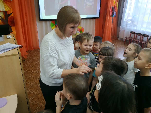 5 остановка. «Угадай на вкус» (дети встают в круг, закрывают глаза, открывают рот.)