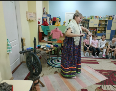 В нашей группе был организован мини-музей по прядению. Ребята, пришедшие на экскурсию, рассматривали экспонаты, с удовольствием слушали рассказ воспитателя об истории прядения в России, смотрели презентацию.