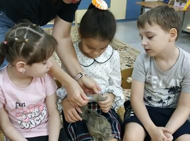 Хозяйка раздает детям шерсть, предлагает растянуть и скрутить её. По ходу работы задает вопросы: Что ты делаешь?