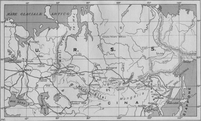 СССР покрывает территорию в 21.176.187 квадратных километров (здесь могли бы уместиться 68 Италий), из которых 16.473.947 квадратных километров находятся в Азии. Огромная часть этой территории пересекается Транссибирской магистралью, построенной в период с 1892 по 1903 гг. (длина 10.157 км). Во время Первой мировой войны было запущено движение по Амурской железной дороге через Владивосток и Карымск по территории России. Транссибирская магистраль дала мощный импульс увеличению масштабов сибирской колонизации и значительно развила Южную Сибирь.