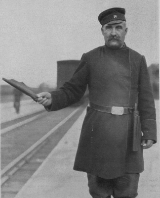 Любопытно заметить, что в то время, как к фуражке прикреплен советский значок, металлическая пряжка ремня всё ещё царская с двуглавым орлом. За неимением автоматической системы все сигналы производятся с помощью флажков.