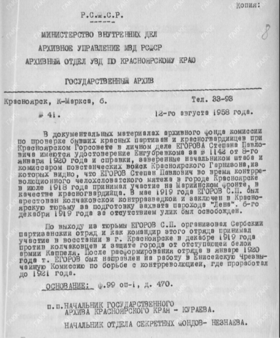 Сегодня знакомим Вас с отрывком воспоминаний Степана Павловича Егорова, хранящихся в Красноярском краевом архиве и датируемых 1958 годом. К этому времени Егоров жил в Новосибирске, в д. № 96 по улице Совнархозовский (ныне – ул. Депутатская). Воспоминания свои Степан Павлович писал к 40-летию описываемых событий, специально для партийного архива Красноярского обкома.